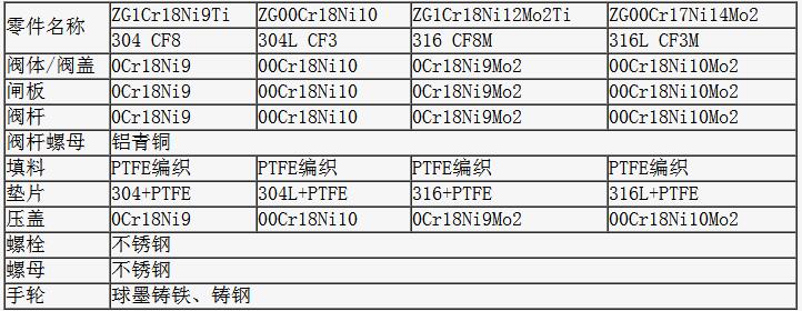 二、Z41W-16P(R) Z41W-25P(R) Z41W-40P(R) Z41W-64P(R)不銹鋼閘閥的主要零件材質: