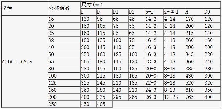 四、不銹鋼法蘭閘閥主要外形尺寸和連接尺寸(mm): Z41W-16P、Z41W-16R主要連接尺寸: