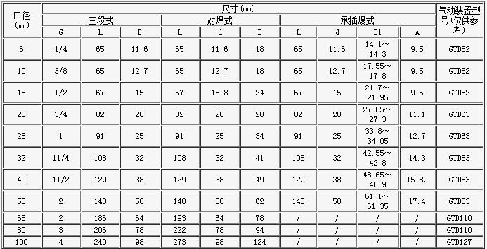 內螺紋氣動球閥安裝尺寸表:
