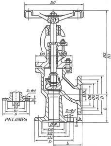 J44H角式截止閥1.6MPa主要連接尺寸: