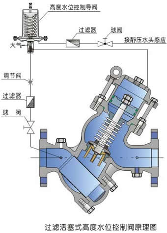 本閥利用水箱(水塔)設定的高低水位的靜壓水頭之差,通過水位高度導閥來控制主閥敏感元件活塞的上下運動以達到主閥的啟閥。當水箱的水位升到設定的高水位時,主閥關閉,停止向水箱供水;當水箱下降到低水位時,主閥打開,向水箱供水。通過調節高度水位導閥的調節螺桿,可以設定高低水位。